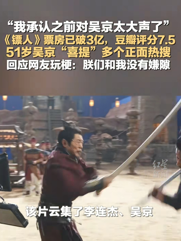 而这一切的反转,绕不开主演吴京。上映前不少网友还对吴京的表演风格有质疑,结果看完影片后集体真香,#我承认之前对吴京太大声了# 直接冲上热搜,全网开启道歉模式。这份反转,全是吴京用实打实的付出换来的:为贴合镖客刀马的形象,他减重15斤,把体脂率压到极低,颧骨突出、眼神锐利,彻底打破以往的硬汉标签;更让人佩服的是,影片全程新疆实景拍摄,55℃高温、8级沙暴的极端环境里,他所有打戏都亲身上阵无替身,肩腿受伤、旧伤复发也咬牙坚持,连兵器碰撞的颤抖、脱力的喘息都真实呈现。