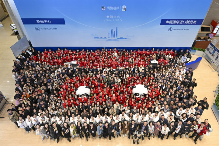 11月10日,第八届中国国际进口博览会在国家会展中心(上海)闭幕,志愿者和工作人员在进博会新闻中心合影。