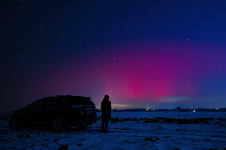 11月12日,在位于黑龙江省黑河市的北大荒集团北安分公司长水河农场有限公司,摄影爱好者在观看绚丽极光。