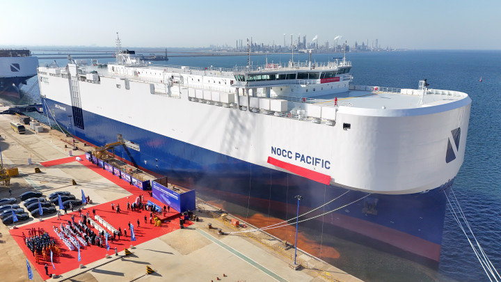 这是11月14日在中集来福士集团龙口建造基地拍摄的“NOCC PACIFIC”号汽车运输船(无人机照片)。该船针对新能源汽车运输安全做出了专门设计,可满足将于2026年1月1日起强制实施的《国际海运危险货物规则》第42-24修正案要求。