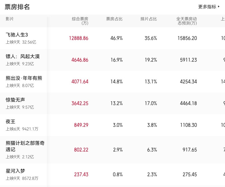 评分高出《飞驰人生3》0.1分的《镖人》,虽然势头迅猛,已经有超过《惊蛰无声》的趋势,但不管是排片占比还是日票房,都还不是《飞驰人生3》的对手。