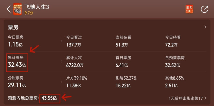 平台预测《飞驰人生3》最终总票房将破43亿,也意味着韩寒再次超越了自己。