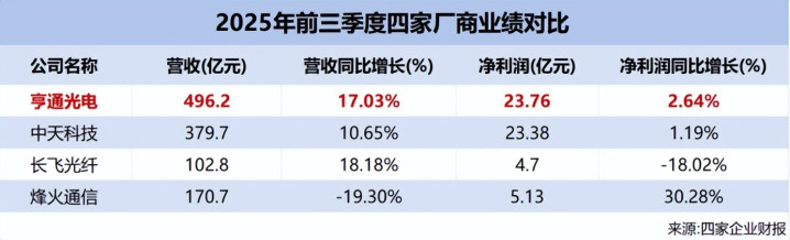 2025年前三季度,亨通光电实现营收496.2亿元,同比增长17.03%;实现净利润23.76亿元,同比增长2.64%。