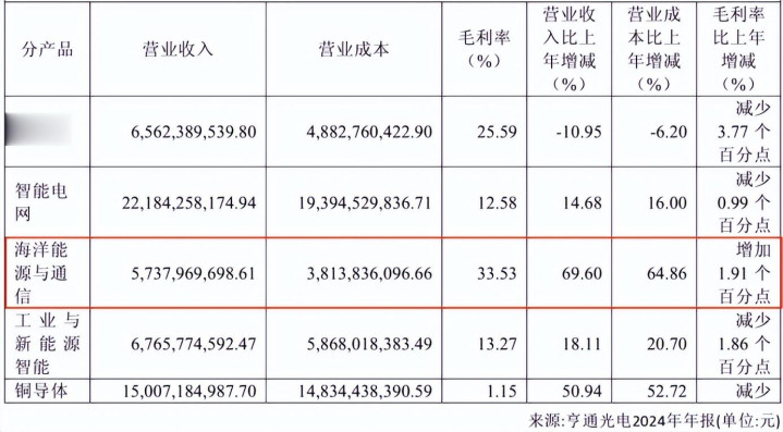 这既是公司主营业务中营收增速最快的,也是毛利率最高的。2024年,亨通光电海洋业务实现营收57.38亿,同比大增69.6%,同期中天科技的海洋业务营收为36.44亿;亨通该业务毛利率高达33.53%,远超中天科技的24.45%。