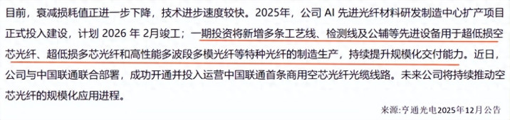 2025年7月,亨通光电推出空芯光纤,在特定波段损耗值≤0.2dB/km,达到国际先进水平。12月,公司与中国联通联合部署其国内首条商用空芯光缆线路,2026年又中标中国移动宁夏公司空芯光缆采购项目。