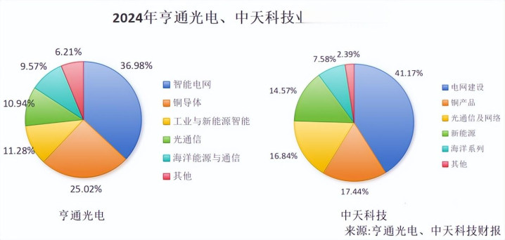 发展至今,亨通光电、中天科技均以电网建设为第一大业务,2024年营收占比分别为37%、41.17%。